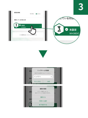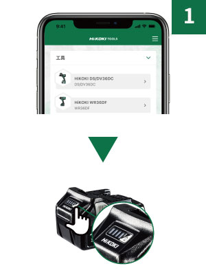 接続している蓄電池にリストに登録済みの工具を装着します。