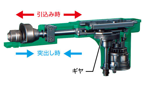 1つのギヤに2つの出力軸を設け、下段をブレード駆動軸、上段をウェイト駆動軸として互いに反対方向へ動作させることで、切断時に発生する振動を効果的に抑制します。
