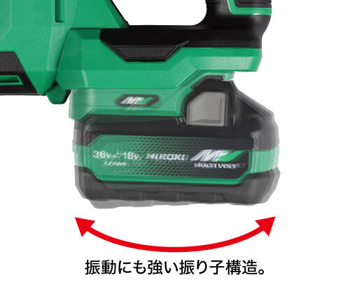 振動を吸収する電池防振構造により、電池接合部への負担を約66%低減※。接点の摩耗やスパークを防ぎ、長期間安心して使用できます。